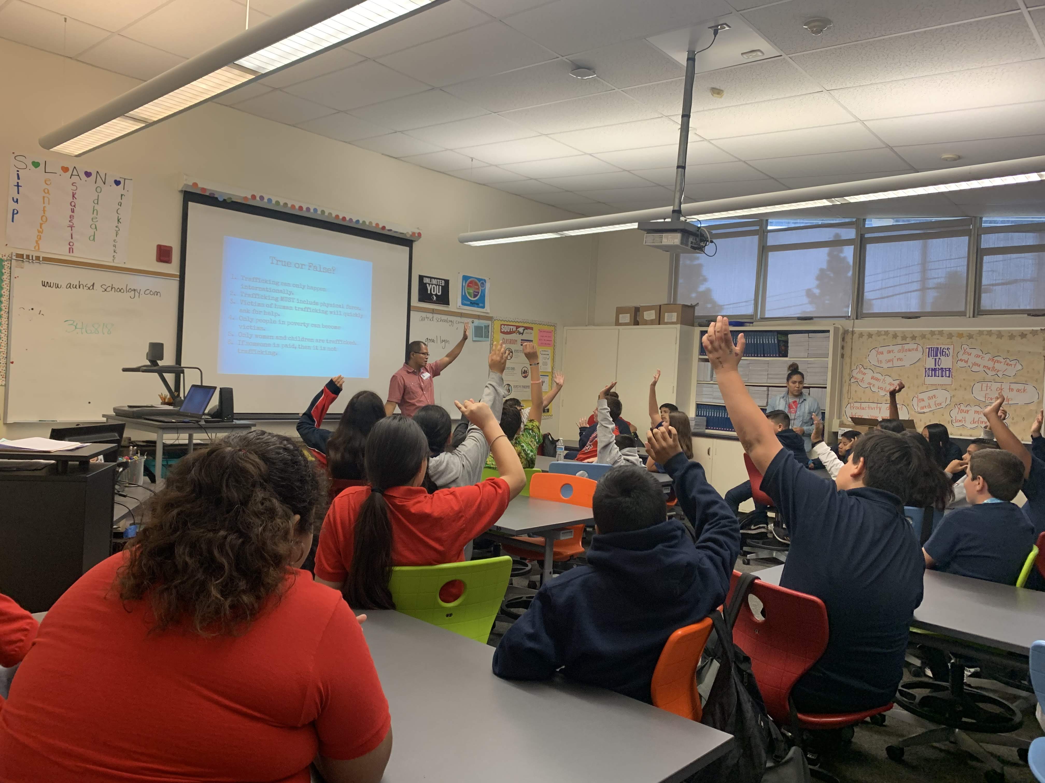 When Joseph and Caitlyn ask the students who has been approached by a potential trafficker through apps, chat rooms, gaming consoles, etc.. About 50% of the students raised their hands. One brave girl also came up to Joseph, Caitlyn and the teacher and shared how she recognized the signs of trafficking in her community and wanted to report it. The teacher stood by her side and helped her call the trafficking hotline to seek help.