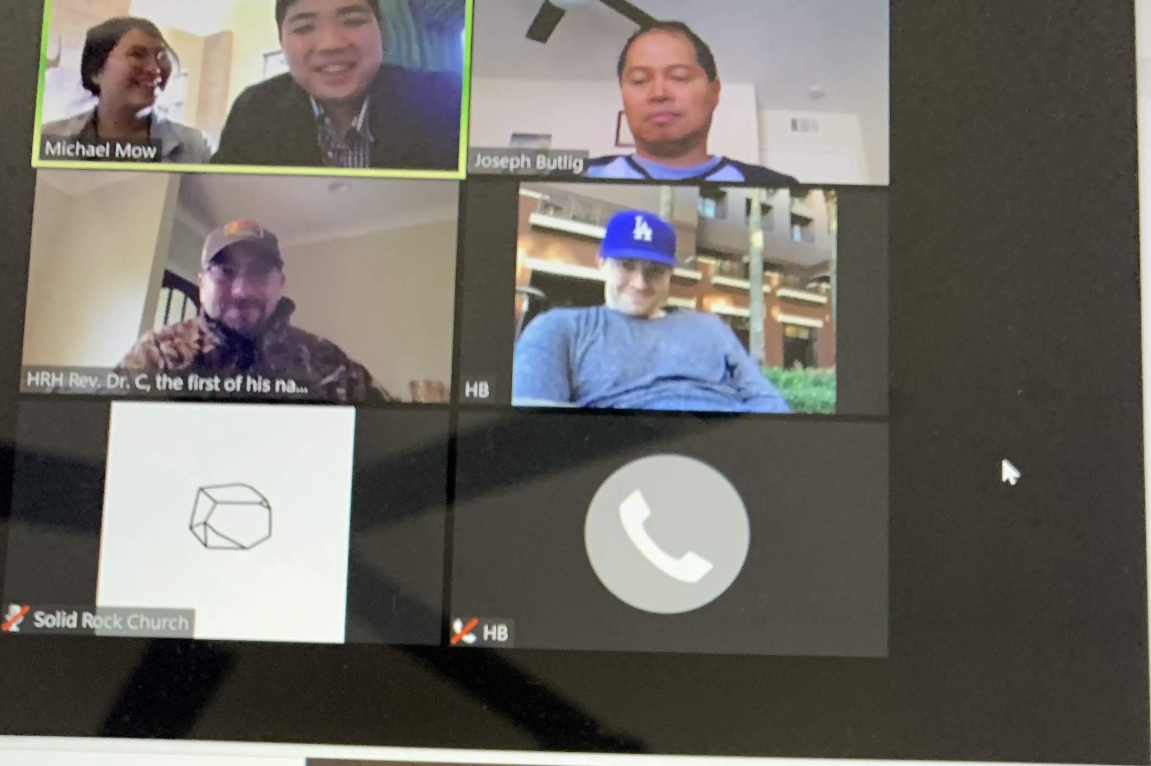 Michael & Lani at their new baby reveal and Joseph and Michael (before social distancing!) Joseph and the elders from Solid Rock discussing qualifications for pastor/elder (Zoom style)